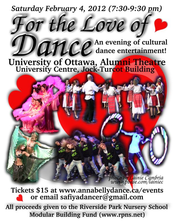 Okay, hot off the presses…I’ve got details on TWO great events for all you dance-a-holics and shop-a-holics: “For The Love of Dance” Multi-Cultural Dance Showcase and Fundraiser…Saturday, February 4th, 2012 7:30 – 9:30 p.m., at the Alumni Theatre, University of Ottawa, Jock Turcott Centre. Tickets are $15 and proceeds donated to the Riverside Park Nursery School building fund. To order tickets/show lineup, check out: http://www.annabellydance.ca/events.html or contact Safiya at: safiyadancer@gmail.com