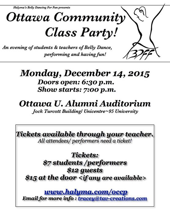 Time to Party!! Join us at Canterbury Community Centre, on Friday, Nov. 22nd, from 7:00 – 8:45 p.m. for our end-of-session celebration hafla. Teachers, students, family, kids, and friends welcome. Bring your coin scarf, a small pot-luck snack to share, and enjoy a fun, family-friendly evening of student performances, with special appearances by some of Ottawa’s premiere dance divas. Want to perform? Just RSVP, and I’ll add you to the list! Let’s show off all our hard work, as we get ready for Halyma’s big show…and cheer each other on!